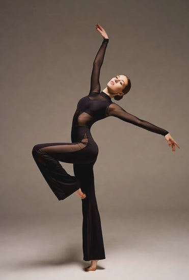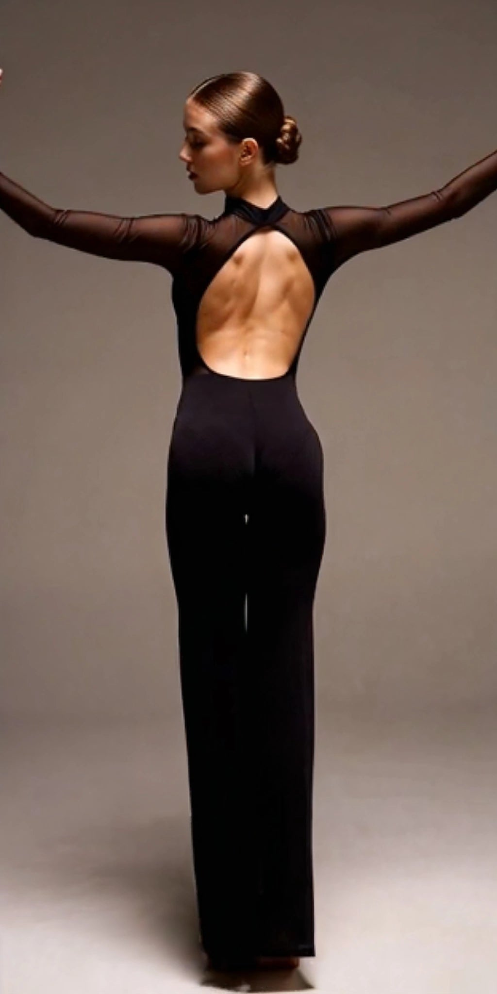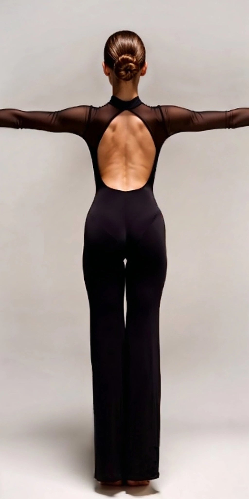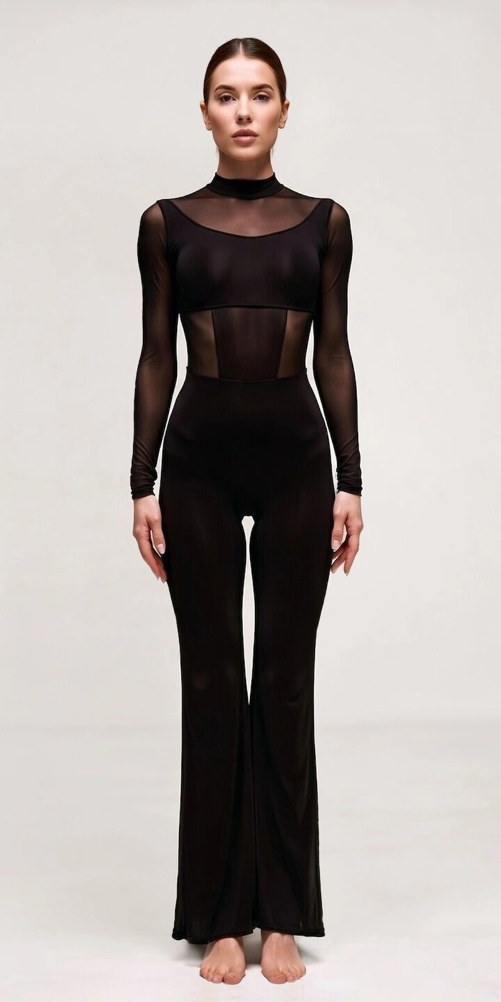 Зробіть свій враження від цього танцювального комбінезона з довгими рукавами, стильними сітчастими вставками та штанами-кльош. Виготовлений з високоякісної матової італійської тканини з поліестеру та еластану, що тягнеться в 4 сторони, з м'яким матеріалом, цей вишуканий дизайн забезпечує ідеальну посадку та повну свободу рухів, що робить його ідеальним для тренувань, репетицій та сценічних виступів, де ви хочете поєднати елегантність та функціональність.